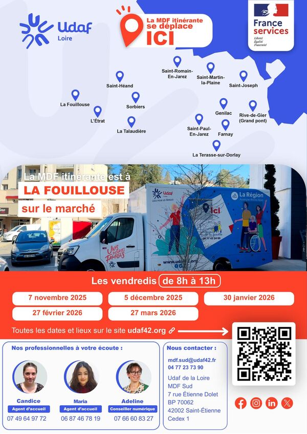 La Maison de la Famille (Bus UDAF) est labélisée France service, ses missions : accueillir, informer et accompagner gratuitement tous les publics sur les thèmes : numérique, parentalité, budget, logement, formation, emploi, retraite, famille, santé, mobilité, justice, renseignements sur les aides et accès aux droits ...